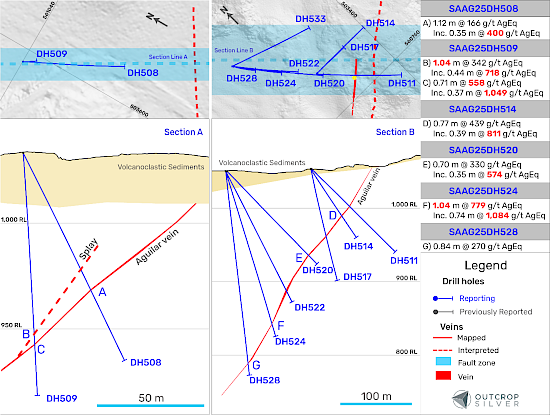 November 26, 2025 – Outcrop Silver & Gold Corporation (TSX:OCG, OTCQX:OCGSF, DE:MRG) (“Outcrop Silver”) is pleased to announce new drill results from its ongoing exploration program at the Santa Ana high-grade silver project in Colombia. Recent drilling has extended the Aguilar vein system by 450 metres to the south, confirming continuity beneath younger volcanosedimentary cover and identifying multiple high-grade intercepts in blind targets. These results significantly expand the known footprint of the vein system and support the potential emergence of a new high-grade shoot. Outcrop Silver continues to drill with three rigs along the fully permitted 17 kilometres mineralized trend in preparation for its Q1 2026 mineral resource update.