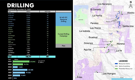 2025 marked the transition from discovery-led exploration to disciplined execution across the Santa Ana system. While new high-grade vein systems continued to be added—including Aguilar, Jimenez, La Ye, Los Mangos, Guadual, and Morena—the primary focus shifted to extending strike and depth, confirming continuity, linking structures, and converting discoveries into resource-ready ounces. This approach strengthened the technical foundation of the project, expanded the scale of known mineralization, and positioned Santa Ana for a materially more robust resource update based on continuity, repeatability, and execution rather than isolated intercepts.